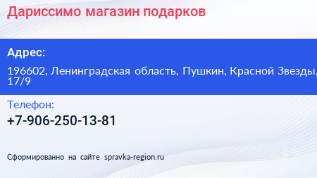 Дариссимо, магазин подарков по адресу 196602, Ленинградская область, Пушкин, Красной Звезды, 17/9 в дальнейшем Организация, размещена в следующих категориях:
