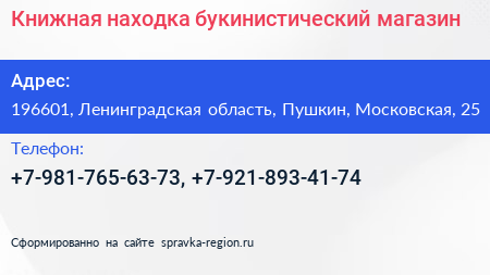 Книжная находка, букинистический магазин по адресу 196601, Ленинградская область, Пушкин, Московская, 25 в дальнейшем Организация, размещена в следующих категориях: