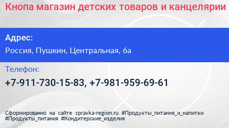 Кнопа, магазин детских товаров и канцелярии по адресу 6А, Центральная улица, Фёдоровское, Фёдоровское городское поселение, Тосненский район, Ленинградская область, Северо-Западный федеральный округ, 187021, Россия в дальнейшем Организация, размещена в следующих категориях: