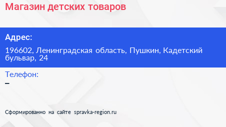 Магазин детских товаров по адресу 196602, Ленинградская область, Пушкин, Кадетский бульвар, 24 в дальнейшем Организация, размещена в следующих категориях: