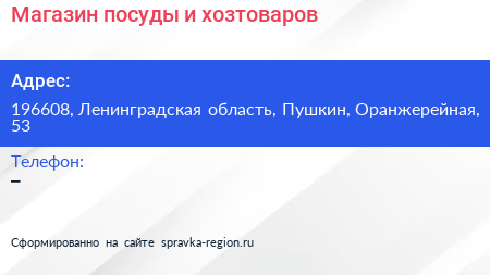 Магазин посуды и хозтоваров по адресу 196608, Ленинградская область, Пушкин, Оранжерейная, 53 в дальнейшем Организация, размещена в следующих категориях:
