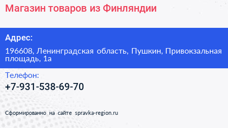Магазин товаров из Финляндии по адресу 196608, Ленинградская область, Пушкин, Привокзальная площадь, 1а в дальнейшем Организация, размещена в следующих категориях: