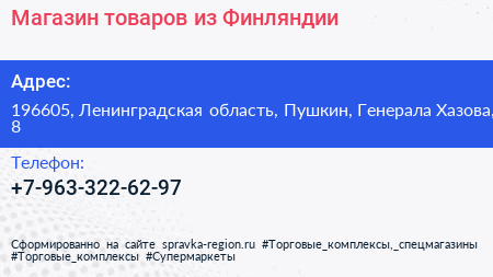 Магазин товаров из Финляндии по адресу 196605, Ленинградская область, Пушкин, Генерала Хазова, 8 в дальнейшем Организация, размещена в следующих категориях: