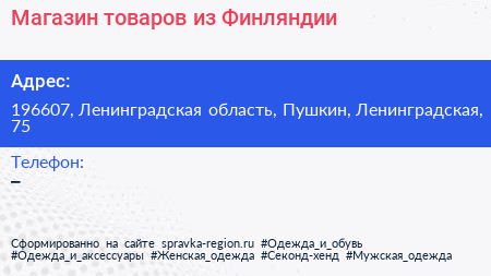 Магазин товаров из Финляндии по адресу 196607, Ленинградская область, Пушкин, Ленинградская, 75 в дальнейшем Организация, размещена в следующих категориях: