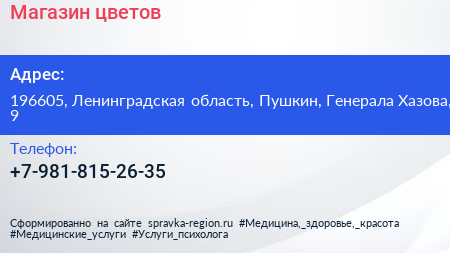 Магазин цветов по адресу 196605, Ленинградская область, Пушкин, Генерала Хазова, 9 в дальнейшем Организация, размещена в следующих категориях: