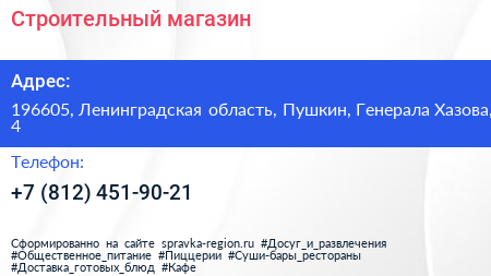 Строительный магазин по адресу 196605, Ленинградская область, Пушкин, Генерала Хазова, 4 в дальнейшем Организация, размещена в следующих категориях: