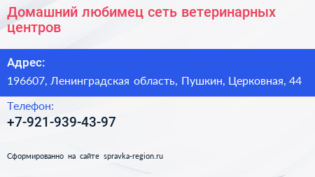 Домашний любимец, сеть ветеринарных центров по адресу 196607, Ленинградская область, Пушкин, Церковная, 44 в дальнейшем Организация, размещена в следующих категориях: