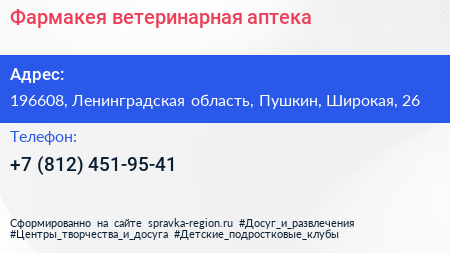 Фармакея, ветеринарная аптека по адресу 196608, Ленинградская область, Пушкин, Широкая, 26 в дальнейшем Организация, размещена в следующих категориях: