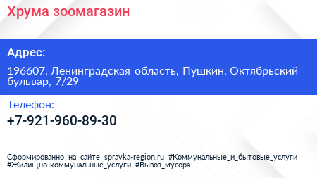Хрума, зоомагазин по адресу 196607, Ленинградская область, Пушкин, Октябрьский бульвар, 7/29 в дальнейшем Организация, размещена в следующих категориях: