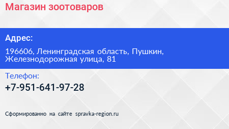 Магазин зоотоваров по адресу 196606, Ленинградская область, Пушкин, Железнодорожная улица, 81 в дальнейшем Организация, размещена в следующих категориях: