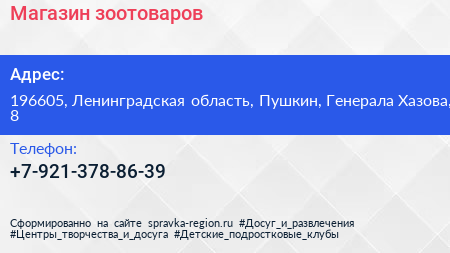 Магазин зоотоваров по адресу 196605, Ленинградская область, Пушкин, Генерала Хазова, 8 в дальнейшем Организация, размещена в следующих категориях: