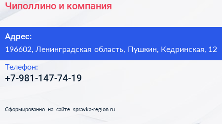 Чиполлино и компания по адресу 196602, Ленинградская область, Пушкин, Кедринская, 12 в дальнейшем Организация, размещена в следующих категориях: