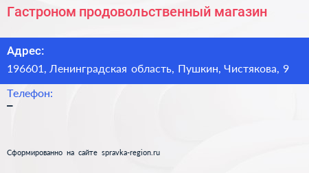 Гастроном, продовольственный магазин по адресу 196601, Ленинградская область, Пушкин, Чистякова, 9 в дальнейшем Организация, размещена в следующих категориях: