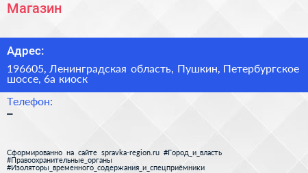 Магазин по адресу 196605, Ленинградская область, Пушкин, Петербургское шоссе, 6а киоск в дальнейшем Организация, размещена в следующих категориях: