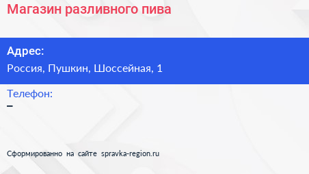Магазин разливного пива по адресу 1, Шоссейная улица, Фёдоровское, Фёдоровское городское поселение, Тосненский район, Ленинградская область, Северо-Западный федеральный округ, 187021, Россия в дальнейшем Организация, размещена в следующих категориях: