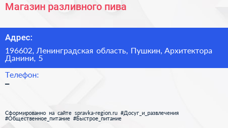 Магазин разливного пива по адресу 196602, Ленинградская область, Пушкин, Архитектора Данини, 5 в дальнейшем Организация, размещена в следующих категориях: