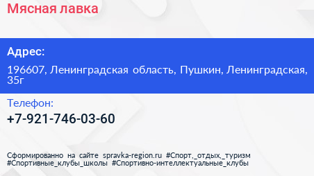 Мясная лавка по адресу 196607, Ленинградская область, Пушкин, Ленинградская, 35г в дальнейшем Организация, размещена в следующих категориях:
