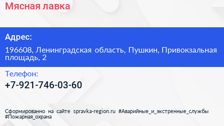 Мясная лавка по адресу 196608, Ленинградская область, Пушкин, Привокзальная площадь, 2 в дальнейшем Организация, размещена в следующих категориях: