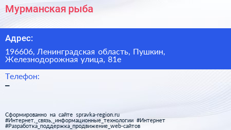 Мурманская рыба по адресу 196606, Ленинградская область, Пушкин, Железнодорожная улица, 81е в дальнейшем Организация, размещена в следующих категориях: