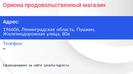 Ориона, продовольственный магазин по адресу 196606, Ленинградская область, Пушкин, Железнодорожная улица, 80а в дальнейшем Организация, размещена в следующих категориях: