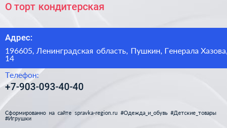 О!торт, кондитерская по адресу 196605, Ленинградская область, Пушкин, Генерала Хазова, 14 в дальнейшем Организация, размещена в следующих категориях: