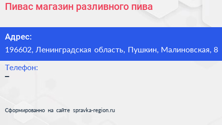 Пивас, магазин разливного пива по адресу 196602, Ленинградская область, Пушкин, Малиновская, 8 в дальнейшем Организация, размещена в следующих категориях: