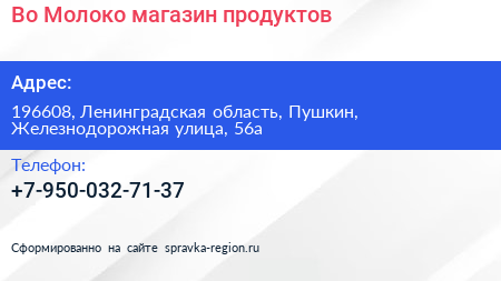 Во! Молоко, магазин продуктов по адресу 196608, Ленинградская область, Пушкин, Железнодорожная улица, 56а в дальнейшем Организация, размещена в следующих категориях: