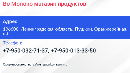 Во! Молоко, магазин продуктов по адресу 196608, Ленинградская область, Пушкин, Оранжерейная, 63 в дальнейшем Организация, размещена в следующих категориях: