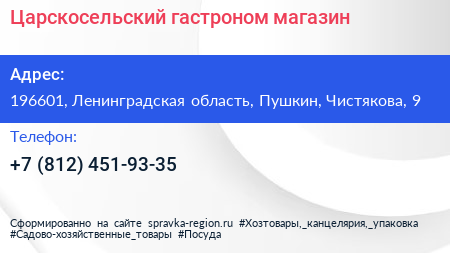 Царскосельский гастроном, магазин по адресу 196601, Ленинградская область, Пушкин, Чистякова, 9 в дальнейшем Организация, размещена в следующих категориях: