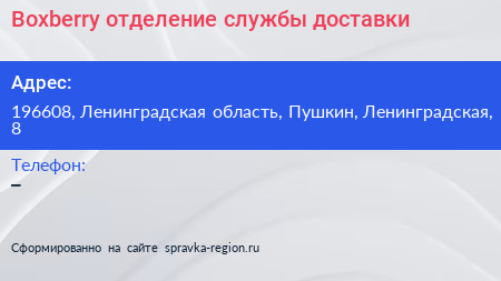 Boxberry, отделение службы доставки по адресу 196608, Ленинградская область, Пушкин, Ленинградская, 8 в дальнейшем Организация, размещена в следующих категориях: