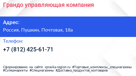 Грандо, управляющая компания по адресу УК "Грандо", Почтовая улица, Фёдоровское, Фёдоровское городское поселение, Тосненский район, Ленинградская область, Северо-Западный федеральный округ, 187021, Россия в дальнейшем Организация, размещена в следующих категориях: