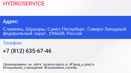HYDROSERVICE по адресу Славянка, Шушары, Санкт-Петербург, Северо-Западный федеральный округ, 196628, Россия в дальнейшем Организация, размещена в следующих категориях: