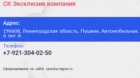 СК Эксклюзив, компания по адресу 196608, Ленинградская область, Пушкин, Автомобильная, 6 лит А в дальнейшем Организация, размещена в следующих категориях: