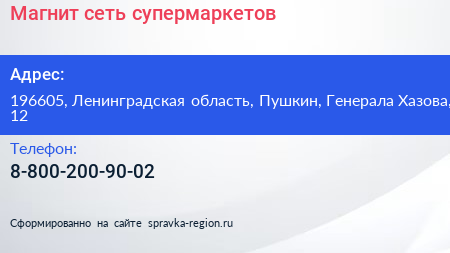 Магнит, сеть супермаркетов по адресу 196605, Ленинградская область, Пушкин, Генерала Хазова, 12 в дальнейшем Организация, размещена в следующих категориях: