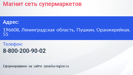 Магнит, сеть супермаркетов по адресу 196608, Ленинградская область, Пушкин, Оранжерейная, 55 в дальнейшем Организация, размещена в следующих категориях: