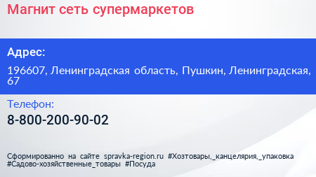 Магнит, сеть супермаркетов по адресу 196607, Ленинградская область, Пушкин, Ленинградская, 67 в дальнейшем Организация, размещена в следующих категориях: