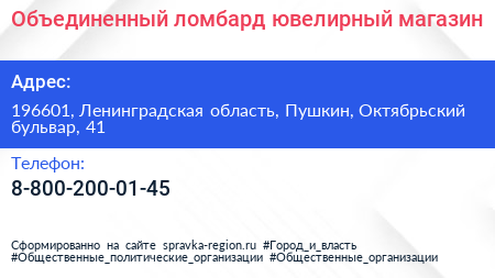 Объединенный ломбард, ювелирный магазин по адресу 196601, Ленинградская область, Пушкин, Октябрьский бульвар, 41 в дальнейшем Организация, размещена в следующих категориях: