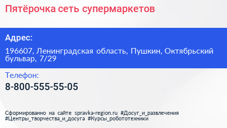 Пятёрочка, сеть супермаркетов по адресу 196607, Ленинградская область, Пушкин, Октябрьский бульвар, 7/29 в дальнейшем Организация, размещена в следующих категориях: