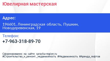 Ювелирная мастерская по адресу 196601, Ленинградская область, Пушкин, Новодеревенская, 19 в дальнейшем Организация, размещена в следующих категориях: