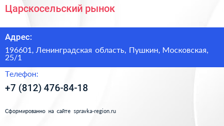 Царскосельский, рынок по адресу 196601, Ленинградская область, Пушкин, Московская, 25/1 в дальнейшем Организация, размещена в следующих категориях: