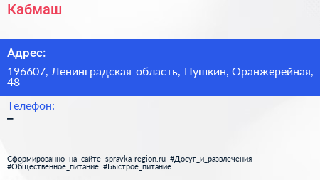 Кабмаш по адресу 196607, Ленинградская область, Пушкин, Оранжерейная, 48 в дальнейшем Организация, размещена в следующих категориях: