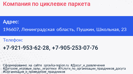 Компания по циклевке паркета по адресу 196607, Ленинградская область, Пушкин, Школьная, 23 в дальнейшем Организация, размещена в следующих категориях: