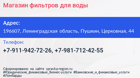 Магазин фильтров для воды по адресу 196607, Ленинградская область, Пушкин, Церковная, 44 в дальнейшем Организация, размещена в следующих категориях: