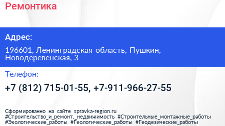 Ремонтика по адресу 196601, Ленинградская область, Пушкин, Новодеревенская, 3 в дальнейшем Организация, размещена в следующих категориях: