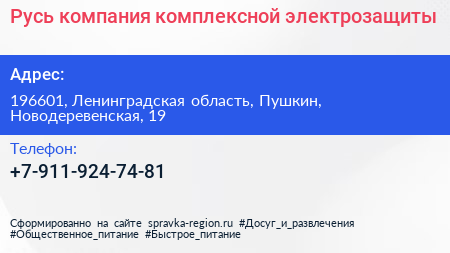 Русь, компания комплексной электрозащиты по адресу 196601, Ленинградская область, Пушкин, Новодеревенская, 19 в дальнейшем Организация, размещена в следующих категориях: