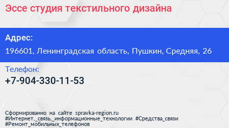 Эссе, студия текстильного дизайна по адресу 196601, Ленинградская область, Пушкин, Средняя, 26 в дальнейшем Организация, размещена в следующих категориях: