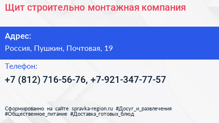 Щит, строительно-монтажная компания по адресу 19, Почтовая улица, Фёдоровское, Фёдоровское городское поселение, Тосненский район, Ленинградская область, Северо-Западный федеральный округ, 187021, Россия в дальнейшем Организация, размещена в следующих категориях: