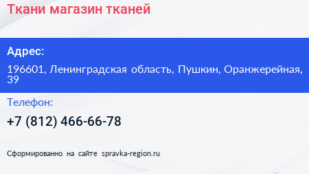 Ткани, магазин тканей по адресу 196601, Ленинградская область, Пушкин, Оранжерейная, 39 в дальнейшем Организация, размещена в следующих категориях: