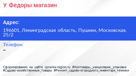 У Федоры, магазин по адресу 196601, Ленинградская область, Пушкин, Московская, 25/2 в дальнейшем Организация, размещена в следующих категориях: