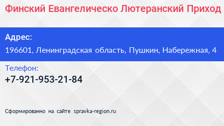 Финский Евангелическо-Лютеранский Приход по адресу 196601, Ленинградская область, Пушкин, Набережная, 4 в дальнейшем Организация, размещена в следующих категориях: